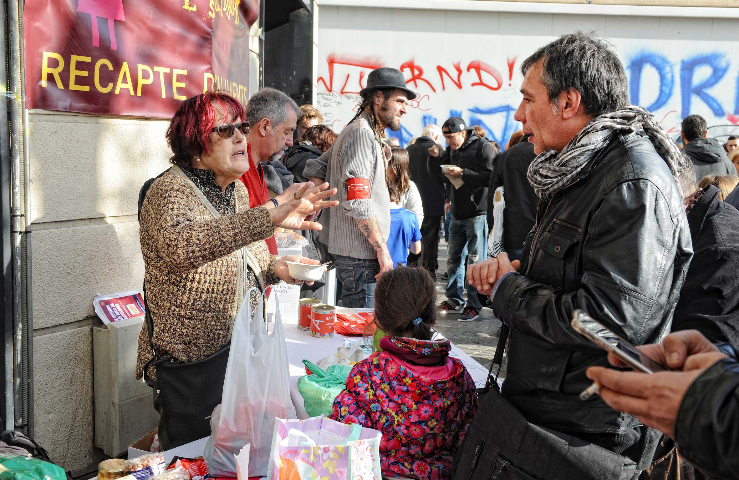 El projecte d’Escudella solidària és una gran festa al barri i alhora un gran moment de recapte per De Veí a Veí. L’acte l’organitza el SAC (Sant Antoni Comerç), és una escudella enorme de tamany i tothom en pot menjar si dóna alguna cosa al recapte de De Veí a Veí. Aquell dia també fem recapte a part del costat de l’escudella a diferents supermercats del barri, fent així un Gran Recapte. Per amenitzar la jornada portem a Music for Food d’espectacle musical.